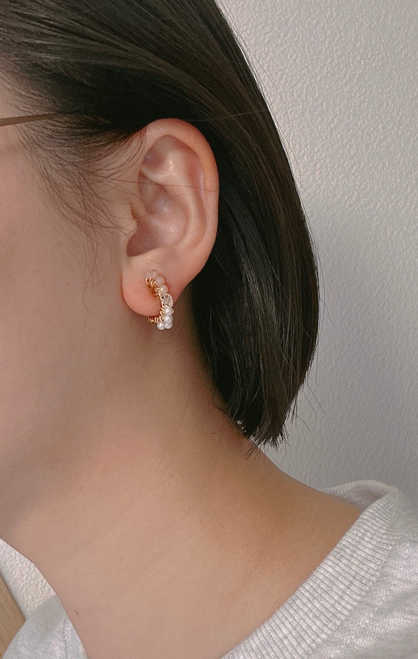 オレンジムーンストーンは、暖かみのある色合いと柔らかな輝きが特徴で、肌なじみが良く、お肌を綺麗に見せてくれます。自然の恵みによって生まれた上品な輝きの淡水パールとダイヤカット水晶を使用することで、横顔を美しく魅せるデザインしました。